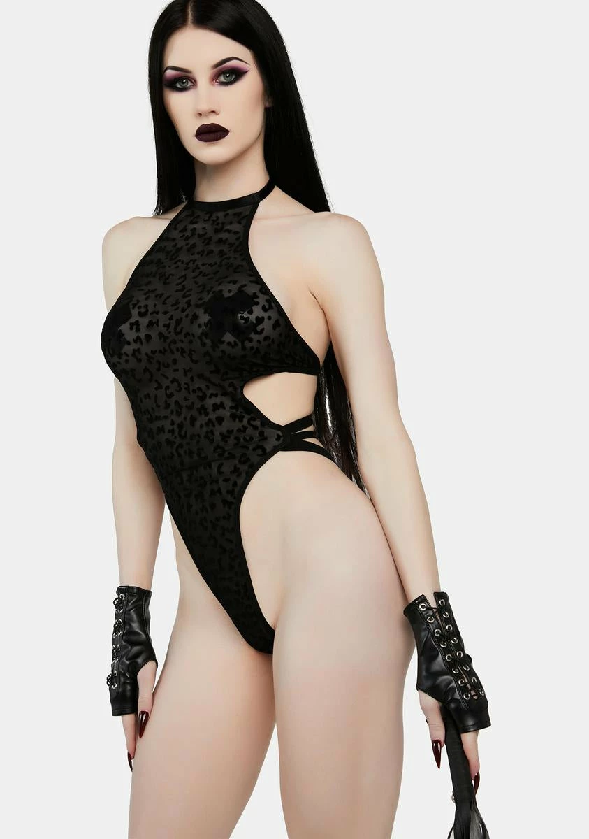 cuz you’re in control now. This sleeveless bodysuit has a sheer mesh construction, a leopard print all over, a high halter neckline, high-cut legs, a strappy open back, and thong rear coverage.