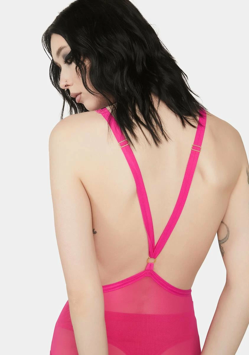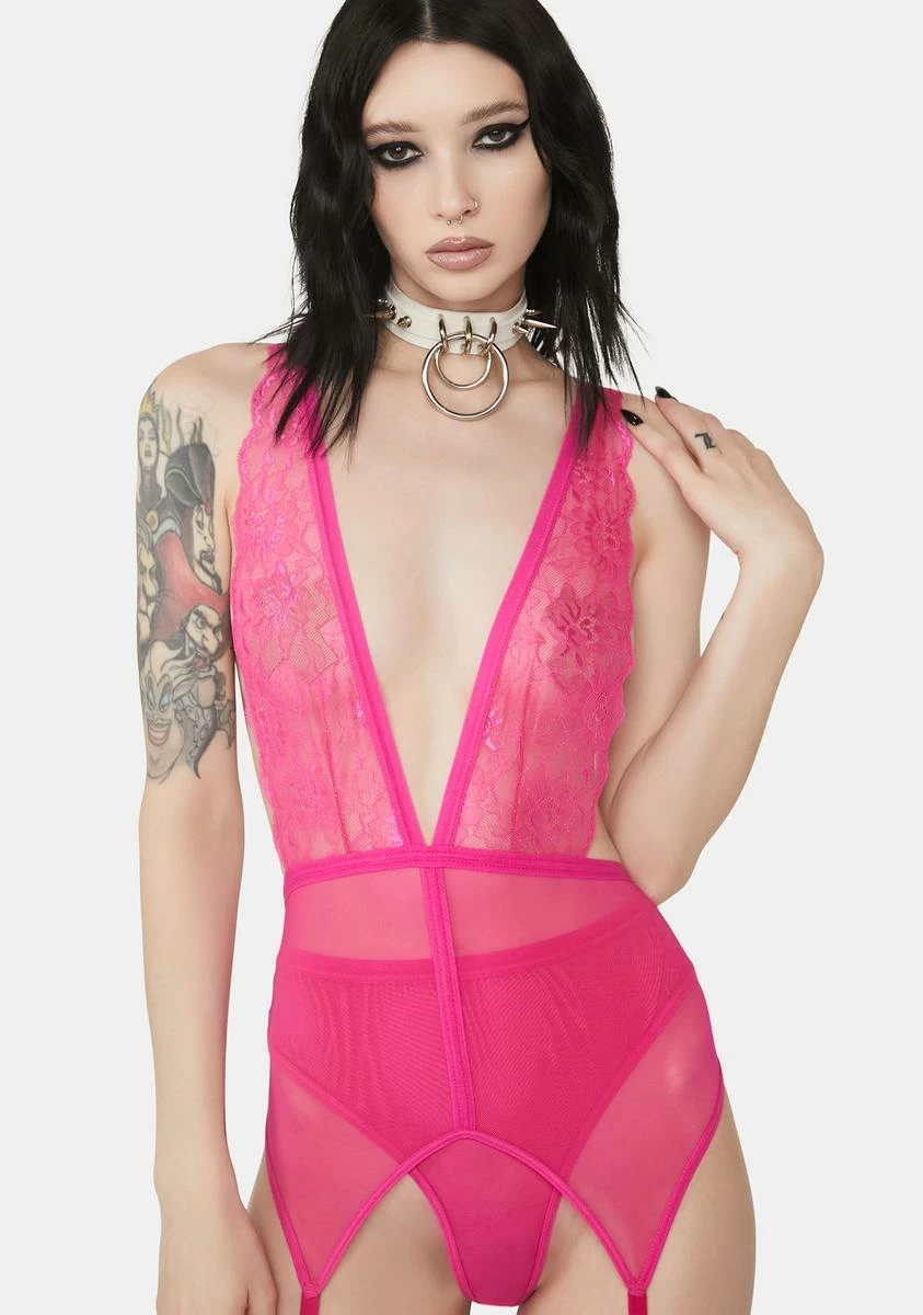 will have you risking it all. This 3-piece teddy, undies, and nude thigh-high stockings set has a plunging V-neckline, a sheer and lace construction, adjustable shoulder straps, and attached adjustable garter straps with clips.