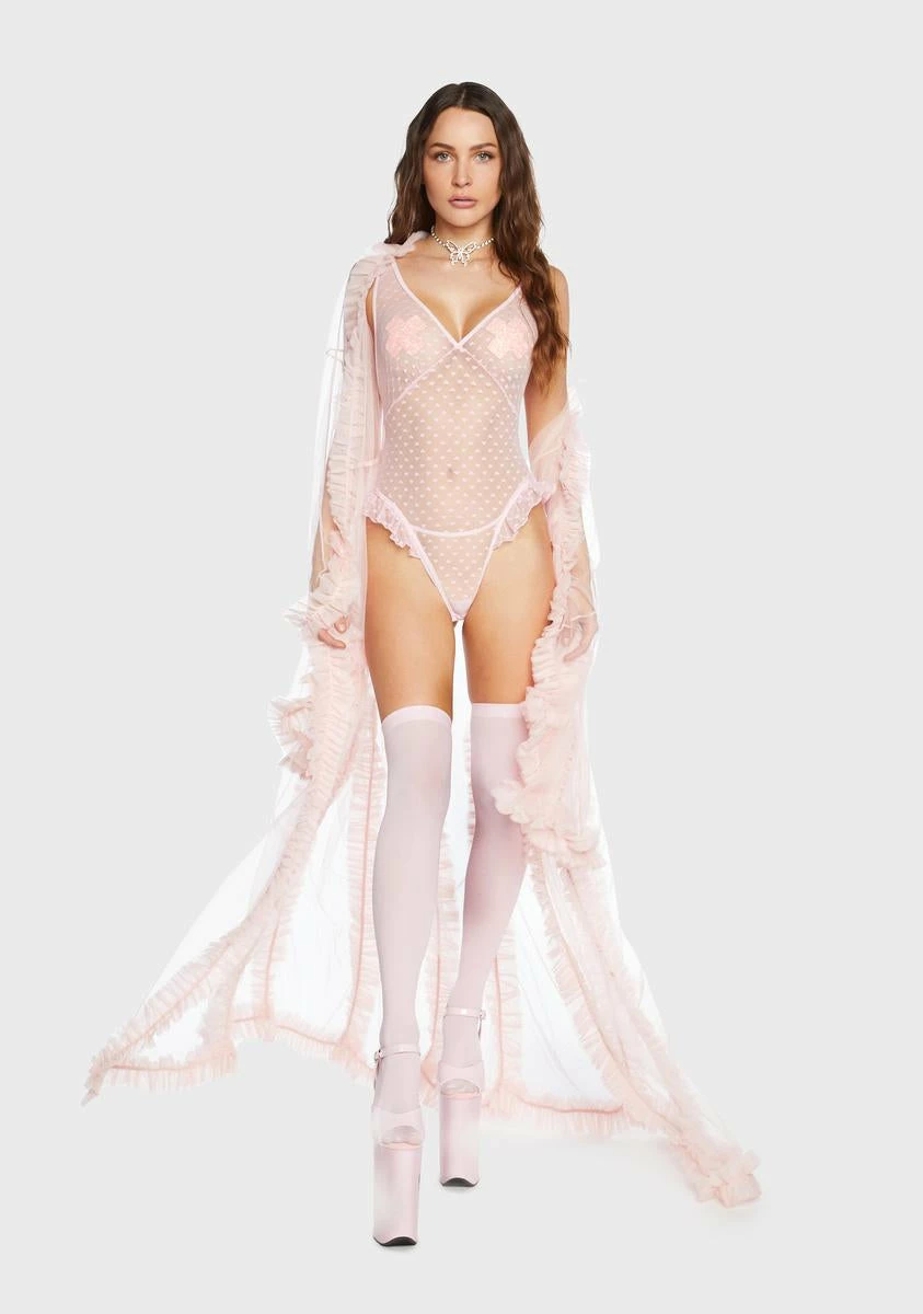 let’s make it count. This teddy comes in a mesh construction, with ruffle details, adjustable straps, a back tie closure, and a heart print all over.