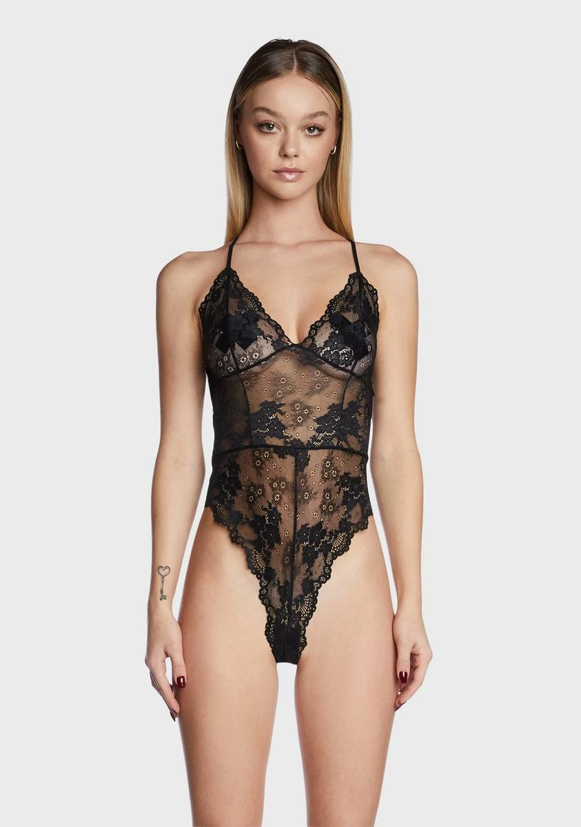 cuz bringing you realness. This teddy has a sheer floral lace construction, a plunging neckline, a scallop trim, and a criss cross back.