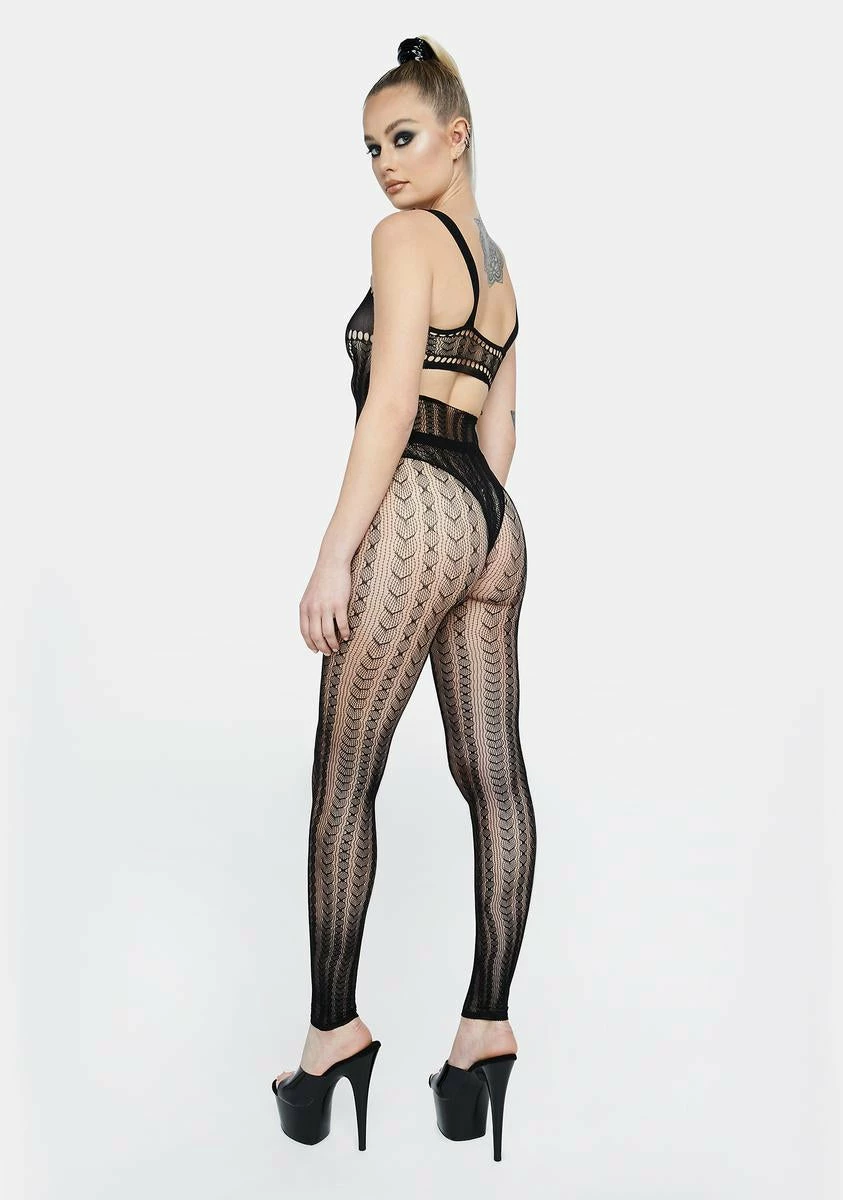 cuz I’m always on your mind. This lingerie set includes a bodysuit with a sheer construction, printed lace up details, small cutouts along the neckline, and matching high-waist leggings with a stripe-y chevron print.