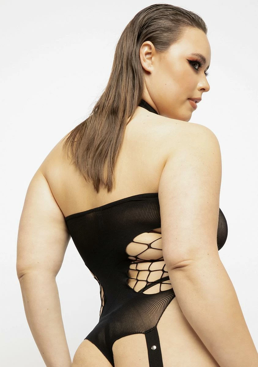 cuz it’s only love and that is all. Make it memorable in this teddy that has a sheer mesh construction, a cut out design with fishnet detailing, a halter neckline with studs, and attached fishnet stockings.