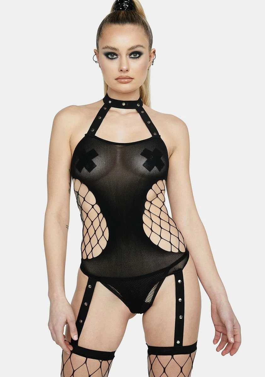 cuz it’s only love and that is all. Make it memorable in this teddy that has a sheer mesh construction, a cut out design with fishnet detailing, a halter neckline with studs, and attached fishnet stockings.