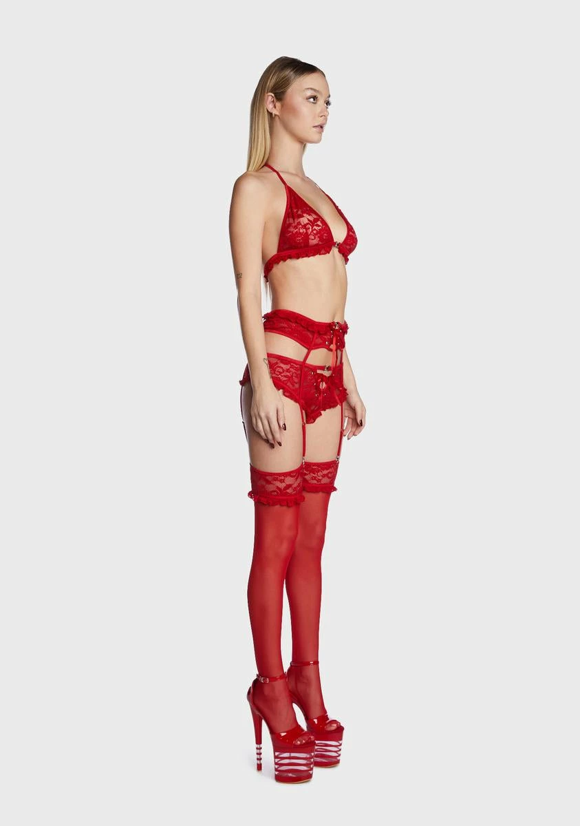 complete bliss. This set comes in a lace construction, with metal hardware, ruffle details, lace up details, and hook and eye closures. Includes bra top, garter belt, and panty.