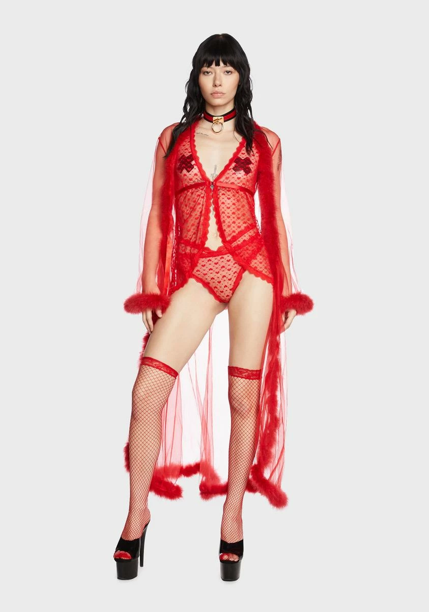 cuz I’d do anything for your love. This 2-piece lingerie set has a stretchy sheer mesh construction, a heart-shaped cutout at back, flocked hearts all over, and an open front with a G-hook closure. Includes a babydoll chemise and strappy thong.