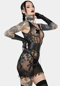 and I’ll bring the heat. This chemise has a fishnet construction, a halter neckline with lace details down the front, crisscross cutouts across the bust, and a bodycon fit.