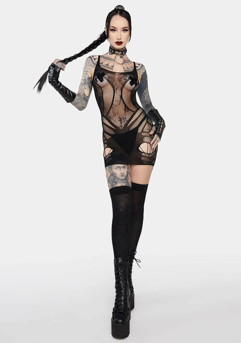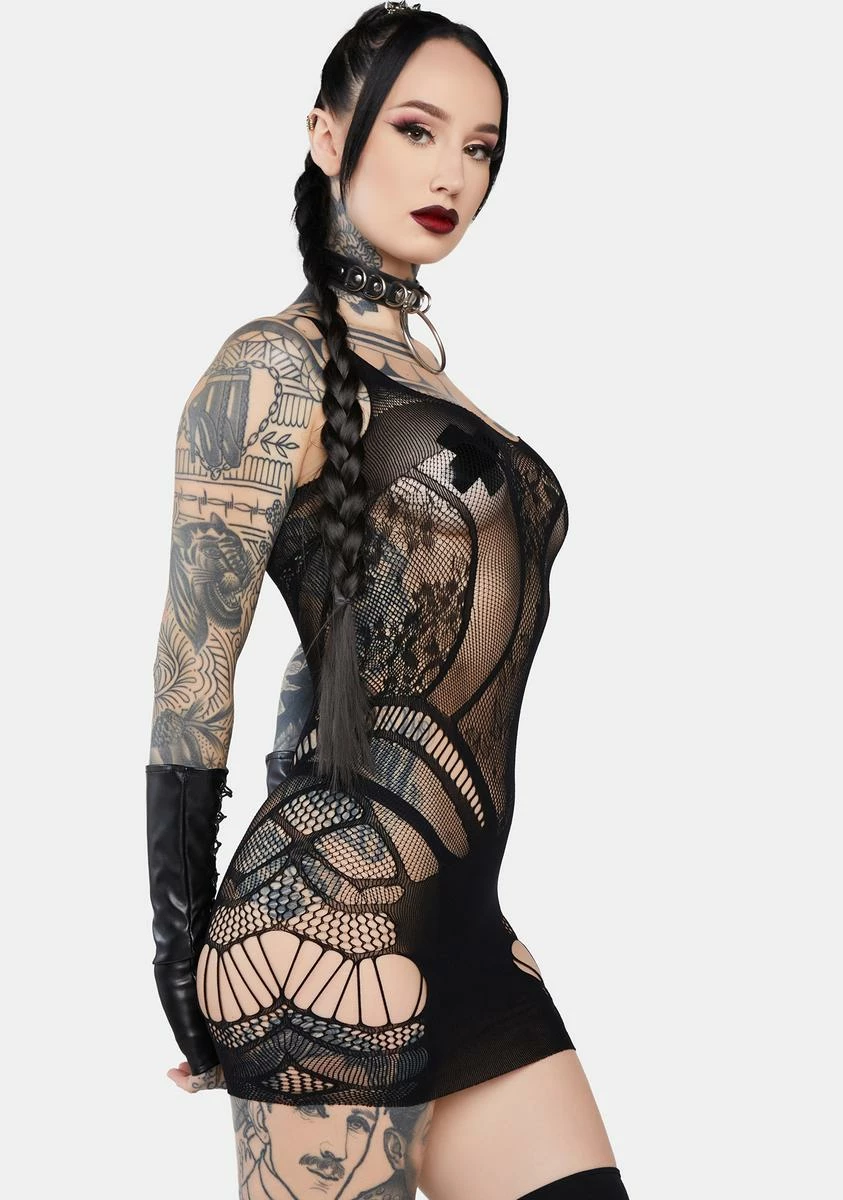 good times only. This chemise has a stretchy fishnet construction with laddered cut-outs and a fitted silhouette.