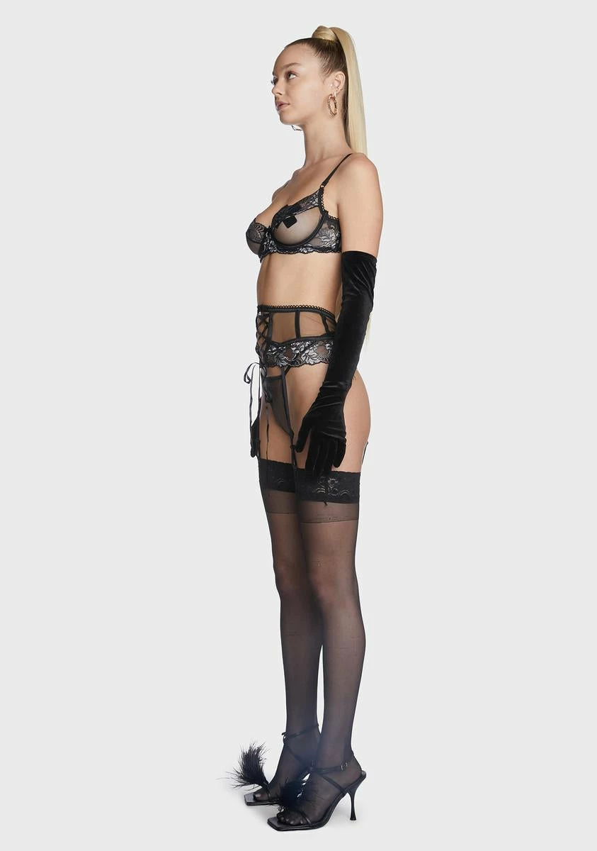 cuz they want you. This three-piece lingerie set has a sheer construction with lace panels, ribbon lace-up trim, underwire support, adjustable shoulder straps, and back hook closures. Includes bra top, g-string panty, and garter belt.