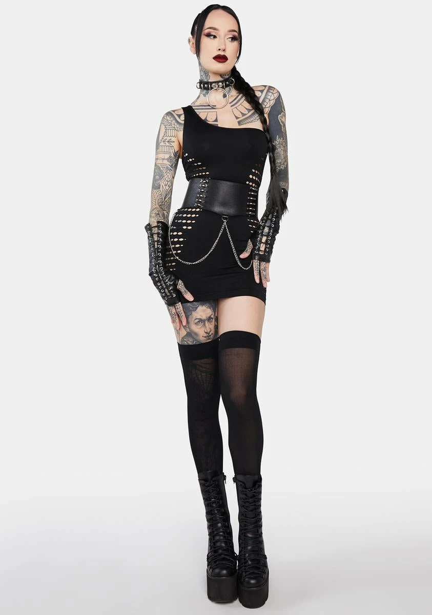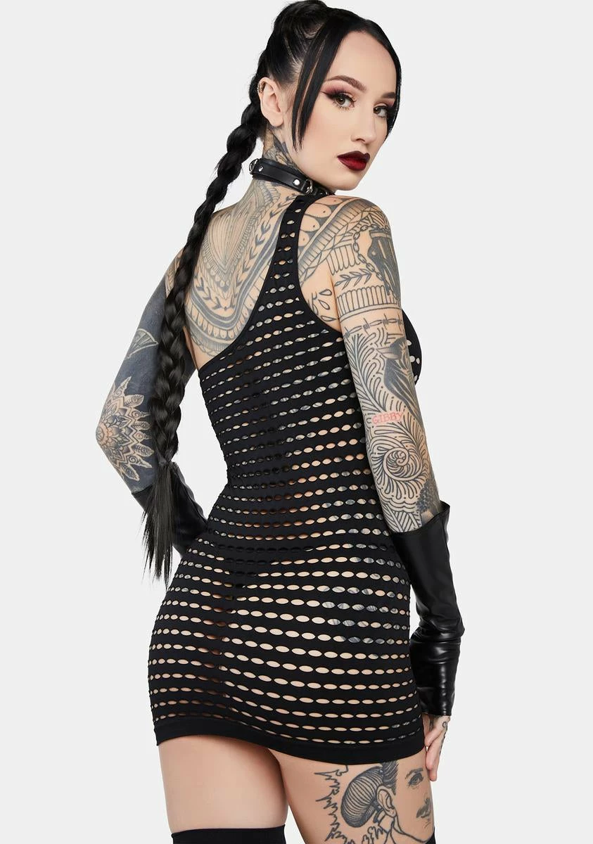 but you don’t wanna be found. This chemise has a stretchy material with hole cut-out designs, a fitted silhouette, and a one-shoulder construction.