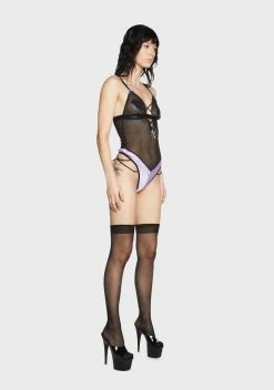 let’s break all the rules. This chemise has a sheer construction, a halter neckline, cutout details with crisscross straps, and a bodycon fit.