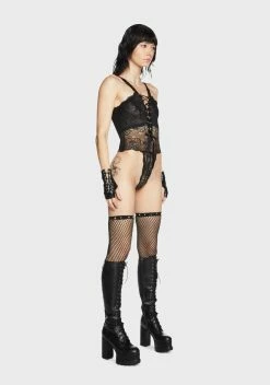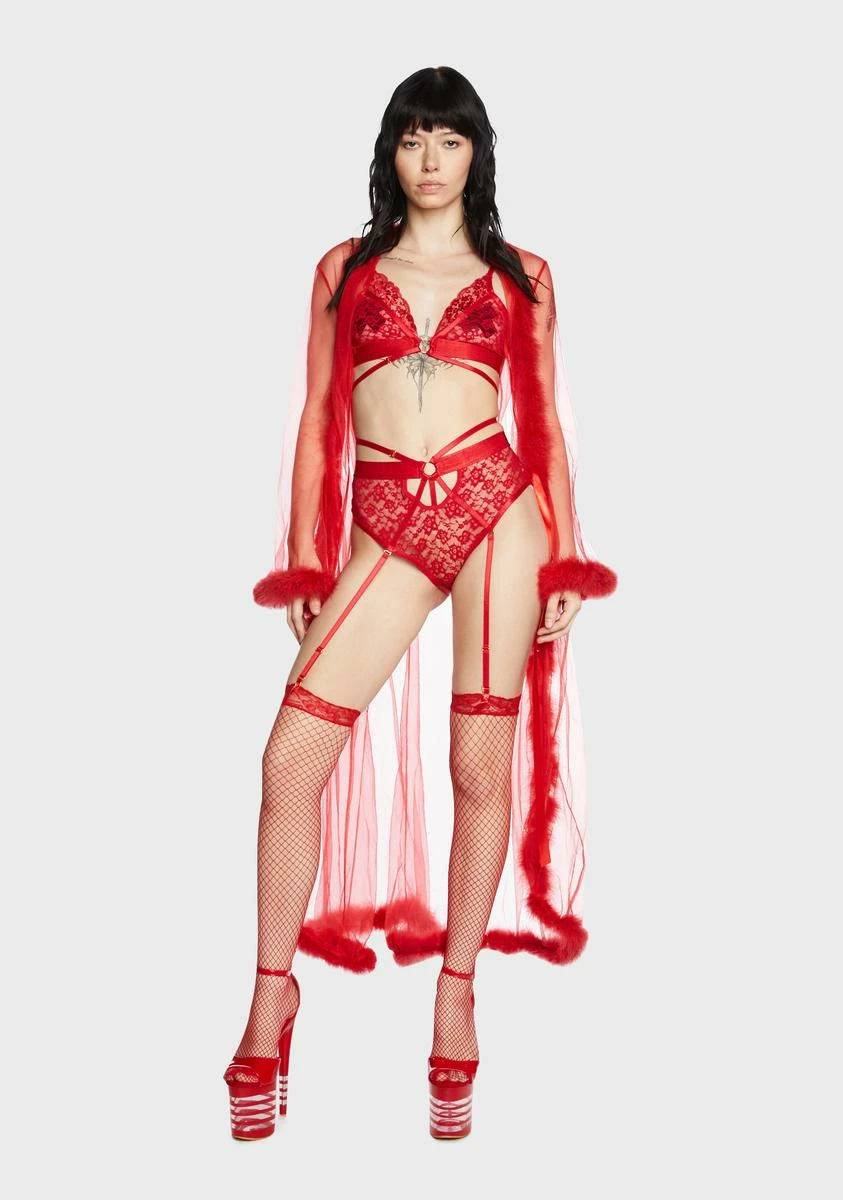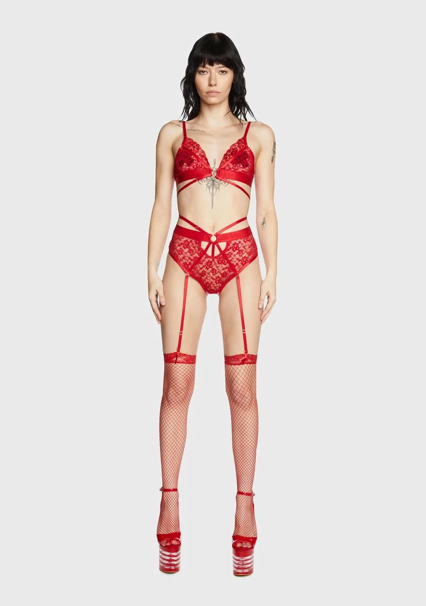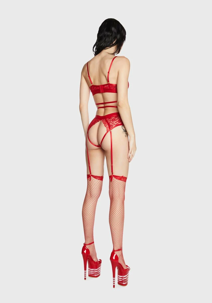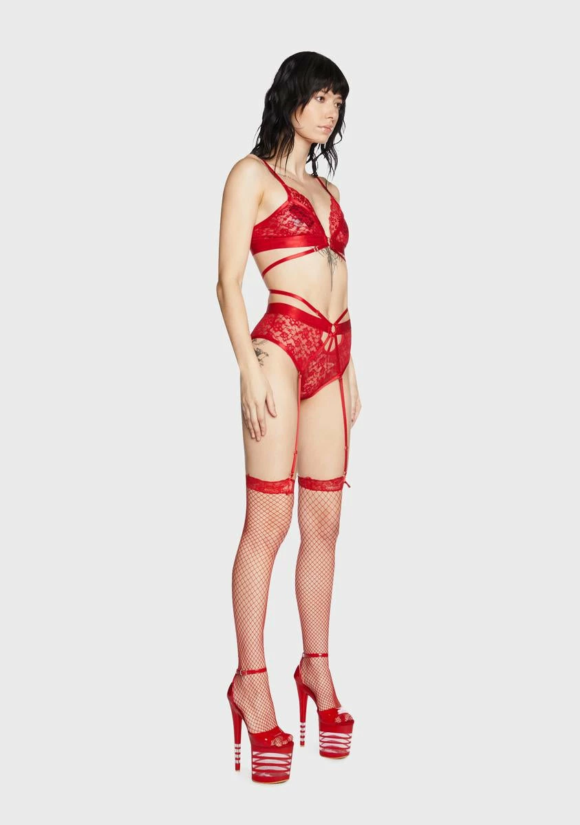 cuz ur so fancy. This lingerie set includes a bra top that has a sheer lace construction, a scallop trim, a strappy design, O-ring hardware, adjustable shoulder straps, and matching panties with attached garter straps.