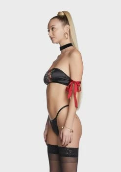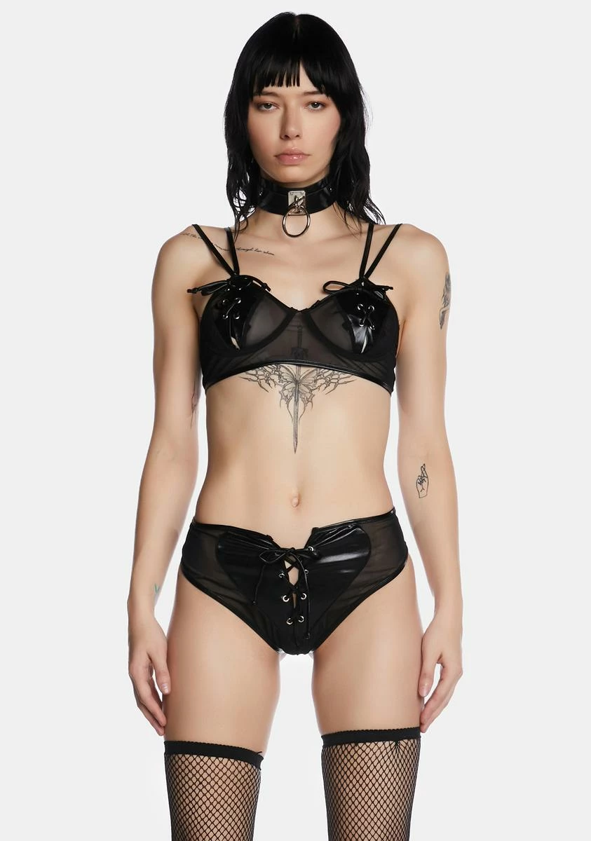 show some love. This lingerie set comes in a sheer construction, with vinyl patchwork details, corset lacing details, adjustable straps, and hook and eye closures.
