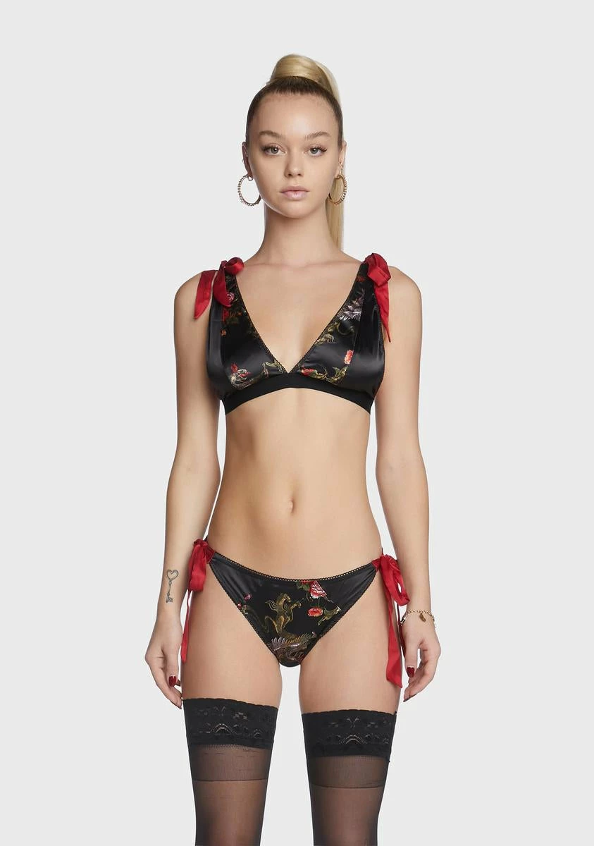 cuz this is your moment. This lingerie set comes in a satin construction, with ribbon tie closures, a v-neckline, and hook and eye closures.