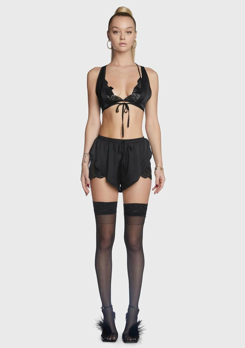 cuz I can feel myself losing you. This lingerie set comes in a satin construction, with lace layering, a front tie closure, adjustable straps, a back hook closure, and matching high waist shorts.