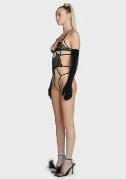 cuz you know you want to. This teddy has a sheer lace construction, a geometric pattern, and a halter neckline.