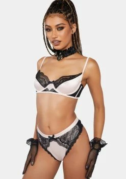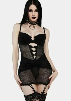 cuz you’re everything they want. This mini dress has ruched bust cups, lace insets, front cutouts with rhinestone hardware, adjustable shoulder straps, attached garter straps, and hook-and-eye closures at back.