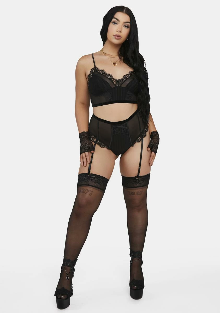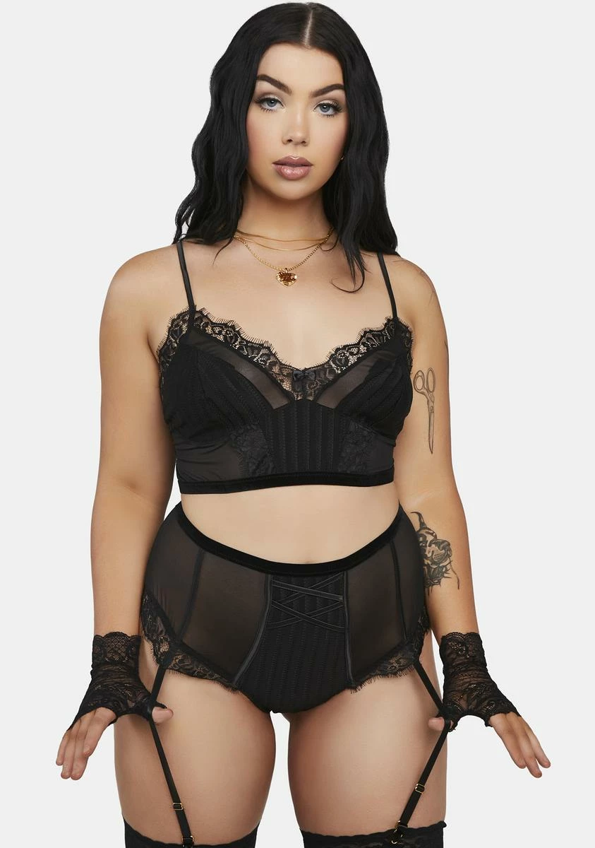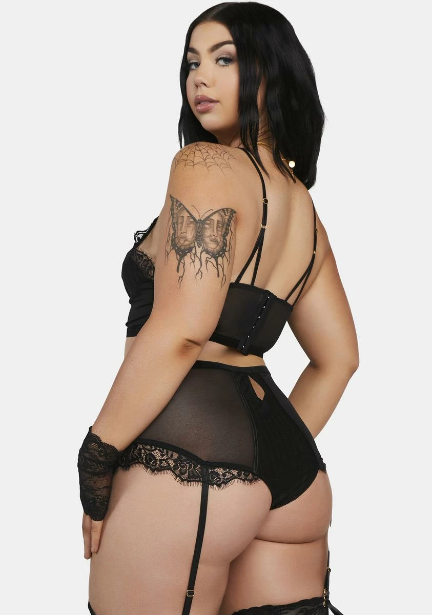 cuz you’re all they think about. This set comes in a sheer mesh construction, with panel details, a bralette top, with adjustable spaghetti straps, hook and eye closures, and a matching bottom, with a high waist, and garter straps.