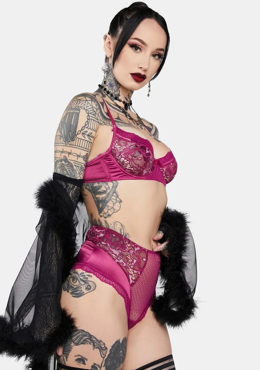 cuz you are racing through their minds. This lingerie set includes a bra top that has a sheer floral lace and mesh construction, satin paneling, an underwire bust, a scallop lace trim, adjustable shoulder straps, and a matching high waist panty with a cut out design.