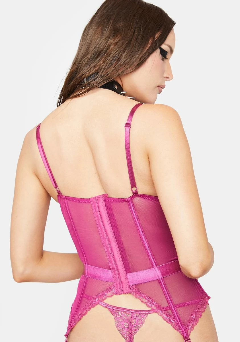 cuz you feel like misbehaving! This lingerie set includes a lace corset top with a structured bust, adjustable shoulder straps, a strappy design, hook and eye closures in the back, attached garter straps, matching thong panties with a cut out design, and garters with a lace trim.