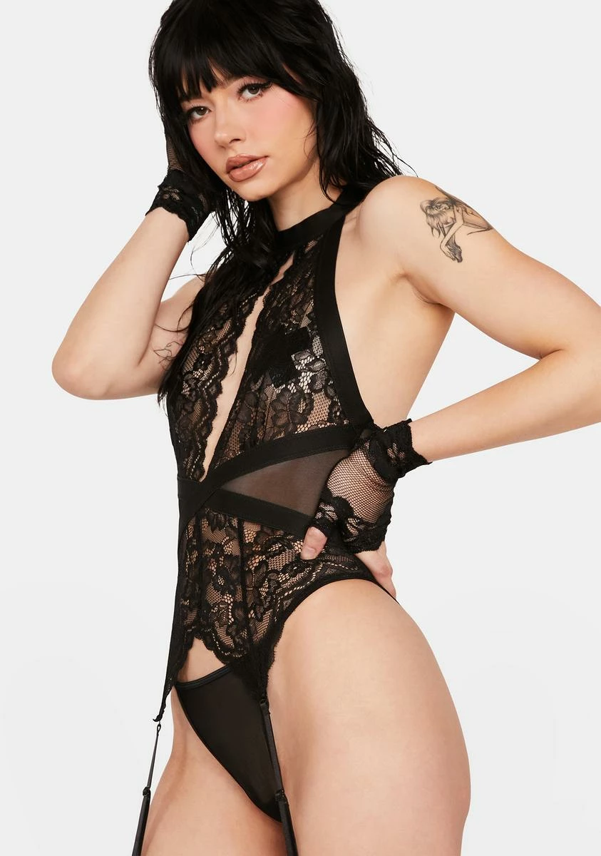 cuz they always want more. This bodysuit comes in a lace and mesh construction, with a halter neckline, keyhole cut out, and garter straps.
