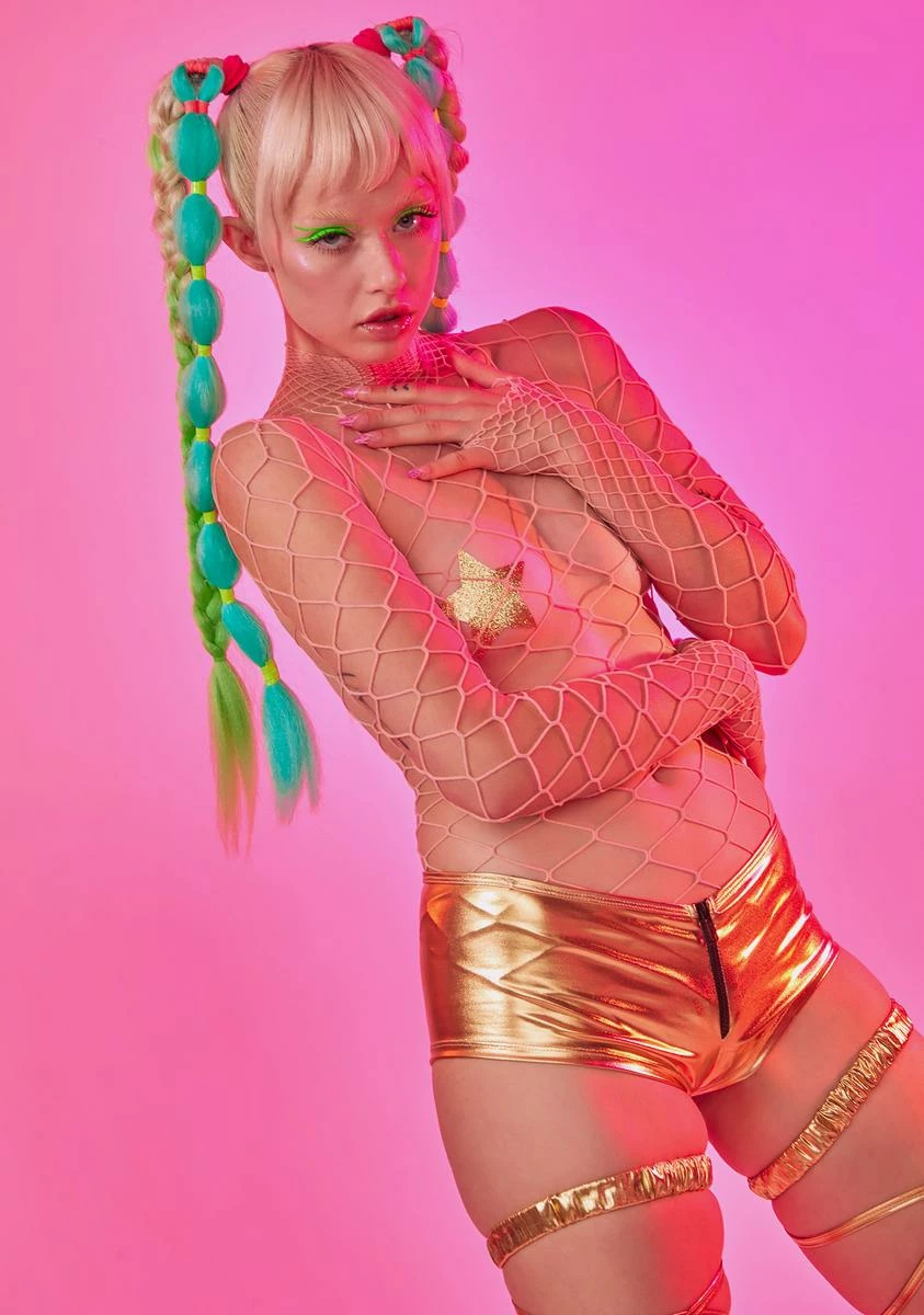 when you’re queen of the damned. This light pink fishnet bodysuit has a high neckline, long sleeves, snap closure and a cheeky back.