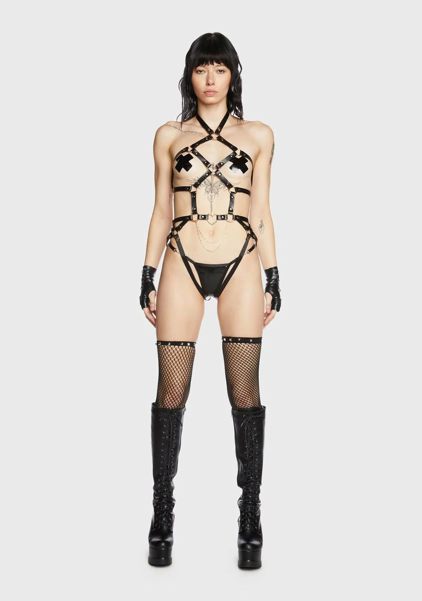 don’t let me go. This harness comes in a vegan leather construction, with stud details, heart hardware details, chain details, and snap off panties.