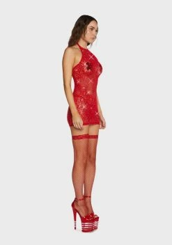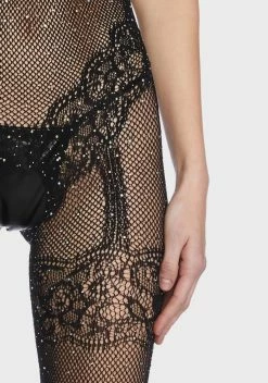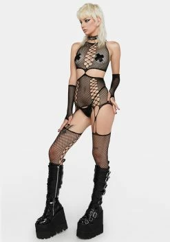 cuz we hate to see you leave. This bodysuit has adjustable halter ties, a sheer and seamless mesh fabrication, a see-through fishnet-style panel at the waist, a keyhole cutout at the bust, and thong rear coverage.