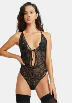 features a sheer floral lace design, a plunge neckline with a tie detail at the front, scalloped trim, a criss cross detail in back, and a hook and eye closure at the crotch.