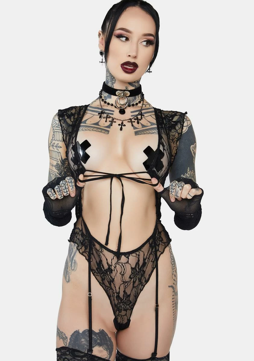 cuz keep it kinky. This teddy has a sheer lace construction, a cut out open front with adjustable tie closures, a lettuce trim, and attached garter straps on the front and back.
