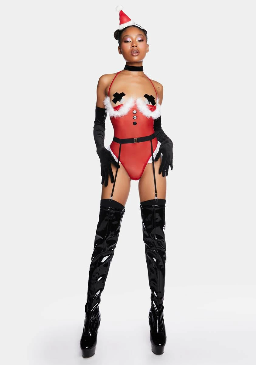 cuz they’re nothing without their mrs. This bodysuit comes in a sheer construction, with lace trim details, feather details, button details, tie closures, a halter neck, an underbust cut out, and a garter belt. Includes Santa hat headband.
