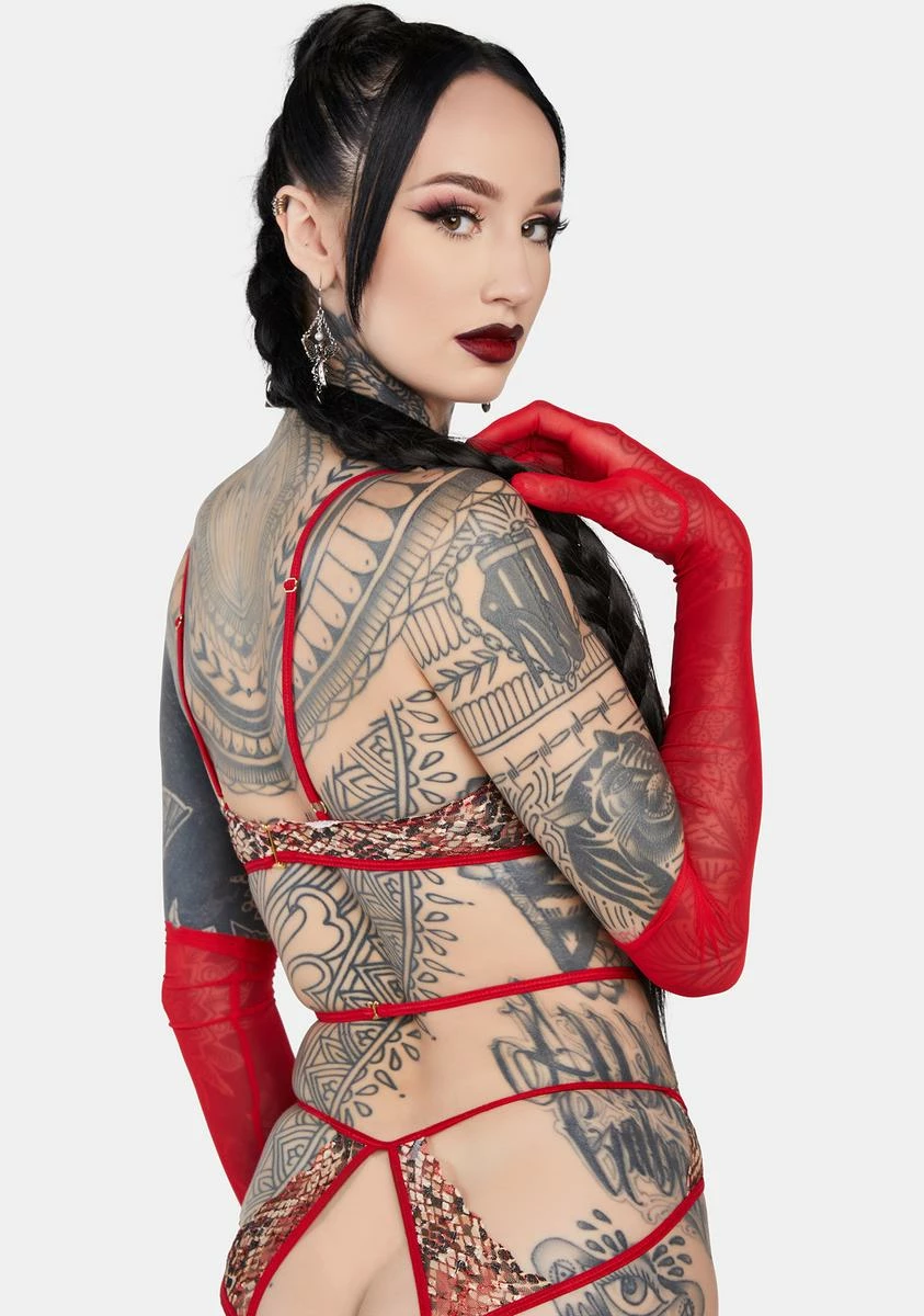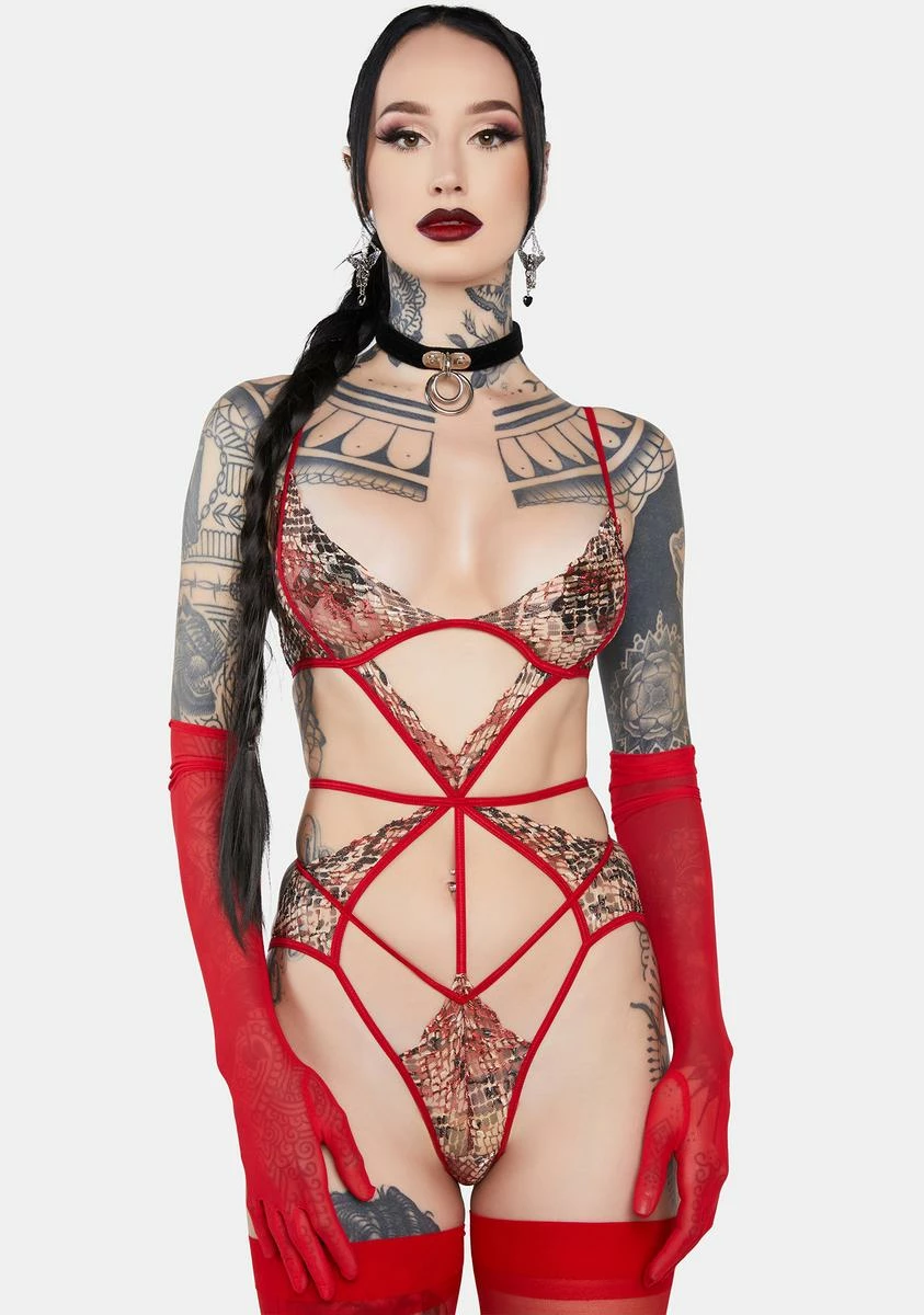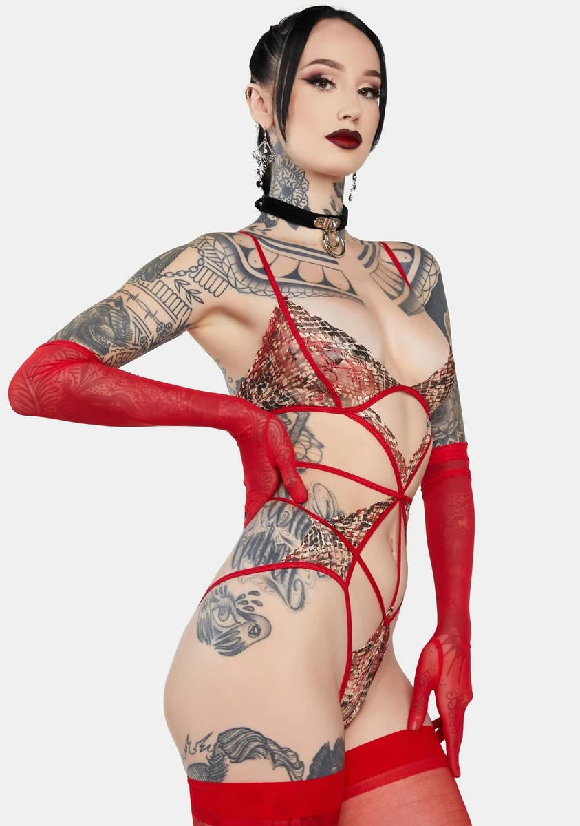 make me beg for it. This sleeveless bodysuit has a stretchy sheer mesh construction, a snakeskin print and cutouts all over, adjustable shoulder straps, back G-hook closures, and thong rear coverage.