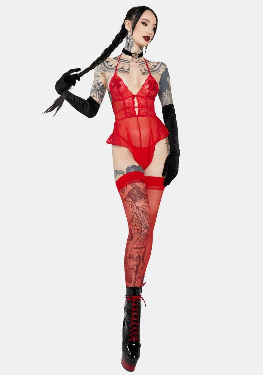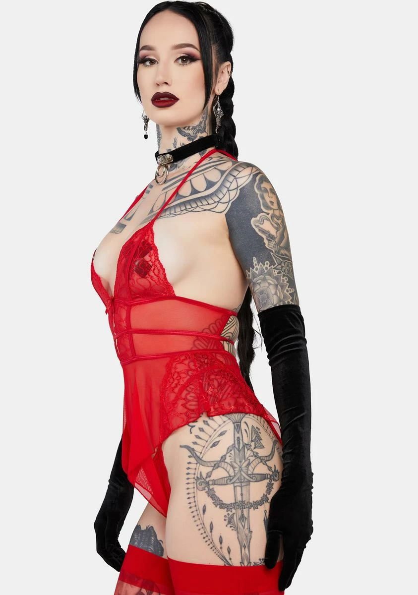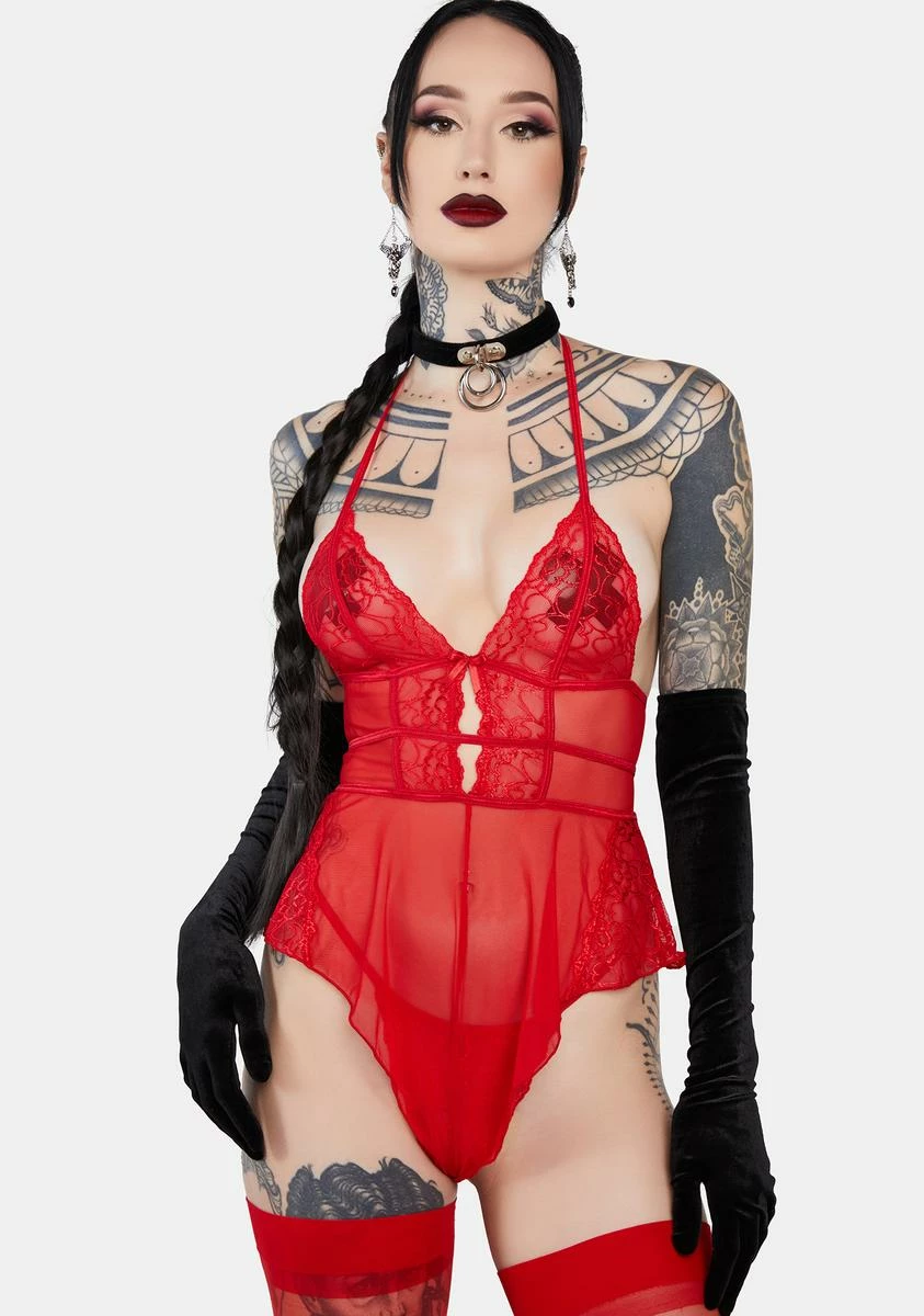 love me ’til my heart stops. This sleeveless romper has a sheer mesh and lace construction, strappy caged details with G-hook closures, a center bow applique, high-cut legs, and adjustable halter ties.