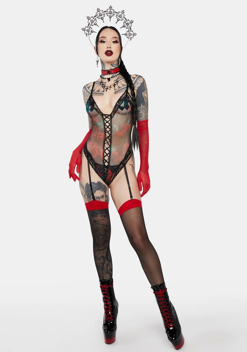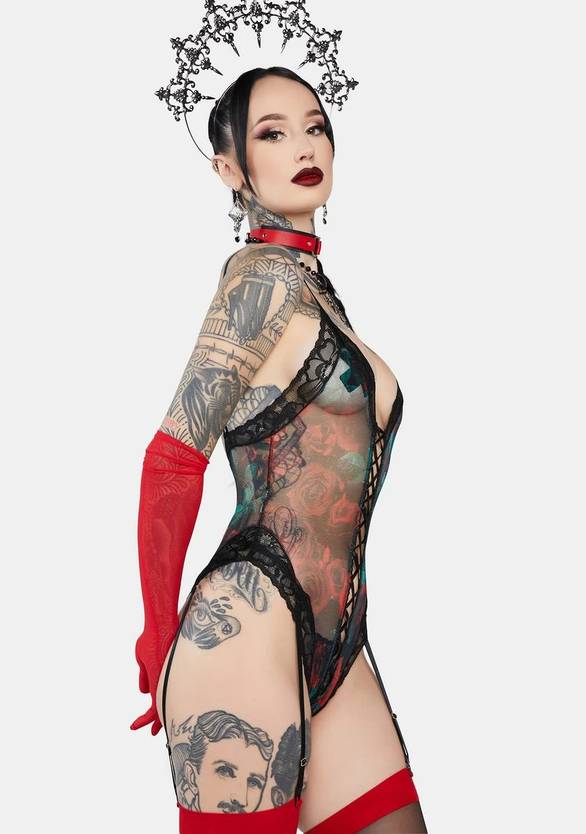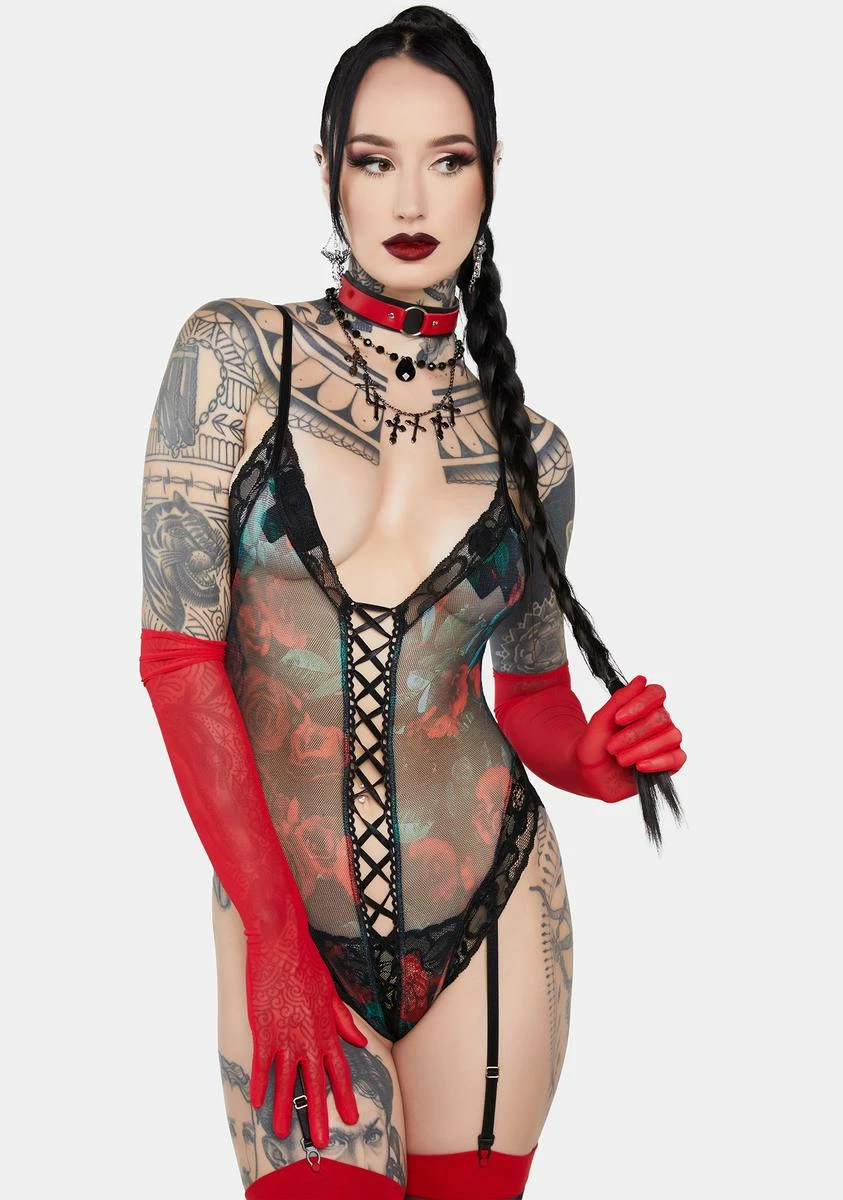 only you can make my heart bloom. This sleeveless teddy has a stretchy sheer mesh and lace construction, a rose print all over, lace-up ties at front and back, attached adjustable garter straps, adjustable shoulder straps, and thong rear coverage.