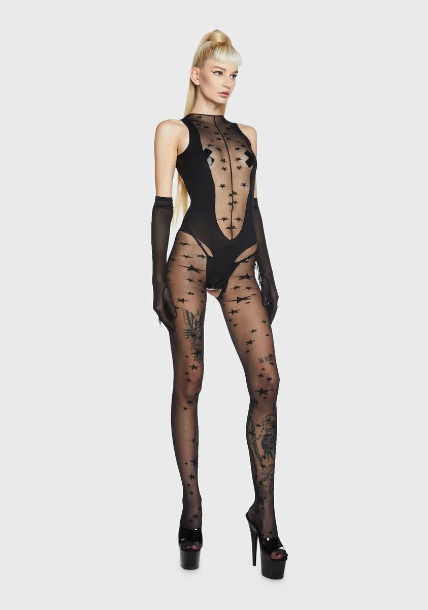 cuz make a wish. This bodystocking has a sheer mesh construction, star graphic detailing, an open back, and a crotchless design.