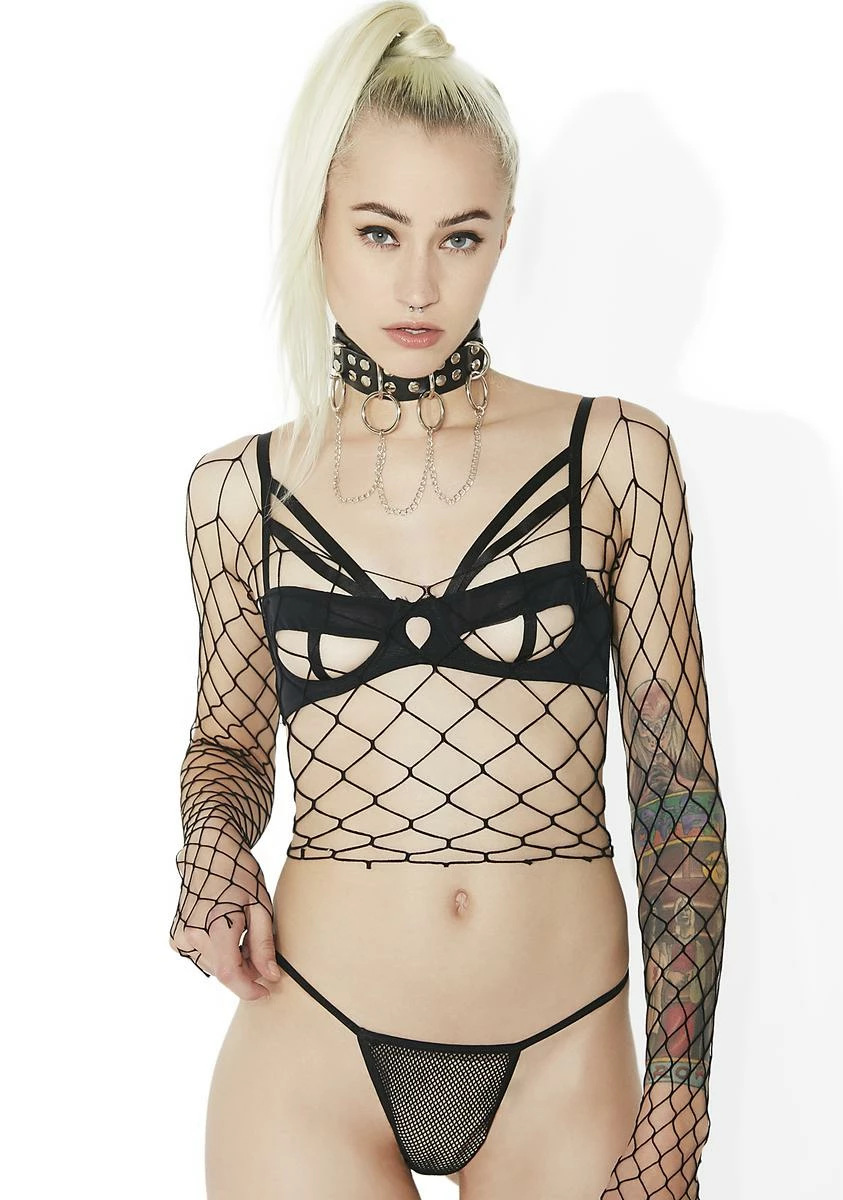 cuz you know how to stay low and slow, babe…Keep âem enthralled in this sikk Nâ sexy top featuring a stretchy large fence net construction, long sleeves, cropped fit and a totally sheer Nâ stretchy fishnet thong.
