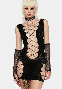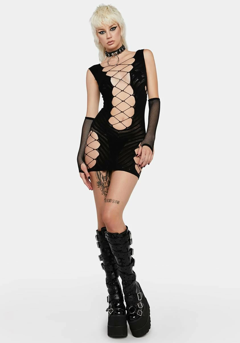 cuz you can forgive but you won’t forget. This mini dress comes in a ripped knit construction, with fishnet cut out details, and fishnet cut outs along the back.