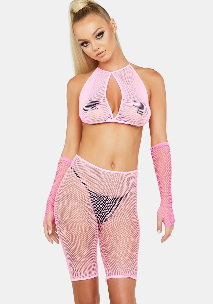cuz after every dark night comes a new day. This crop top, biker shorts, and arm warmers set has a sheer fishnet fabrication, a keyhole cutout at the bust, adjustable halter and back ties, and finger holes.