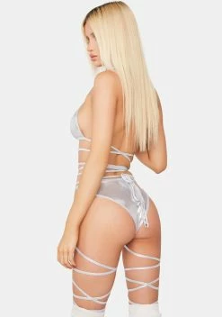 cuz you always get what you want. This 3-piece bralette, thong, and garter set has a sheer construction, adjustable spaghetti straps all over, and G-string rear coverage.