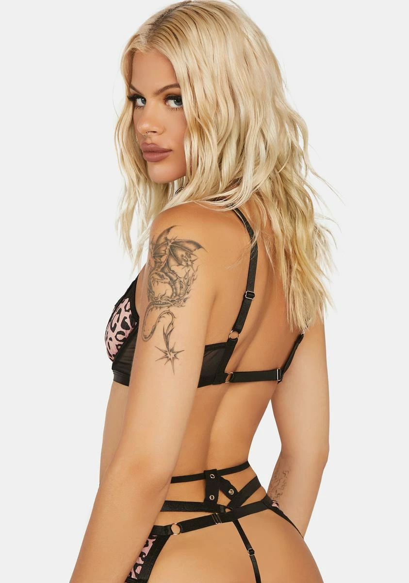 cuz it’s time to get wild. This bra, garter belt, and undies set has leopard print all over, a partially-sheer mesh construction, adjustable straps all over, grommet hardware, and G-string coverage.