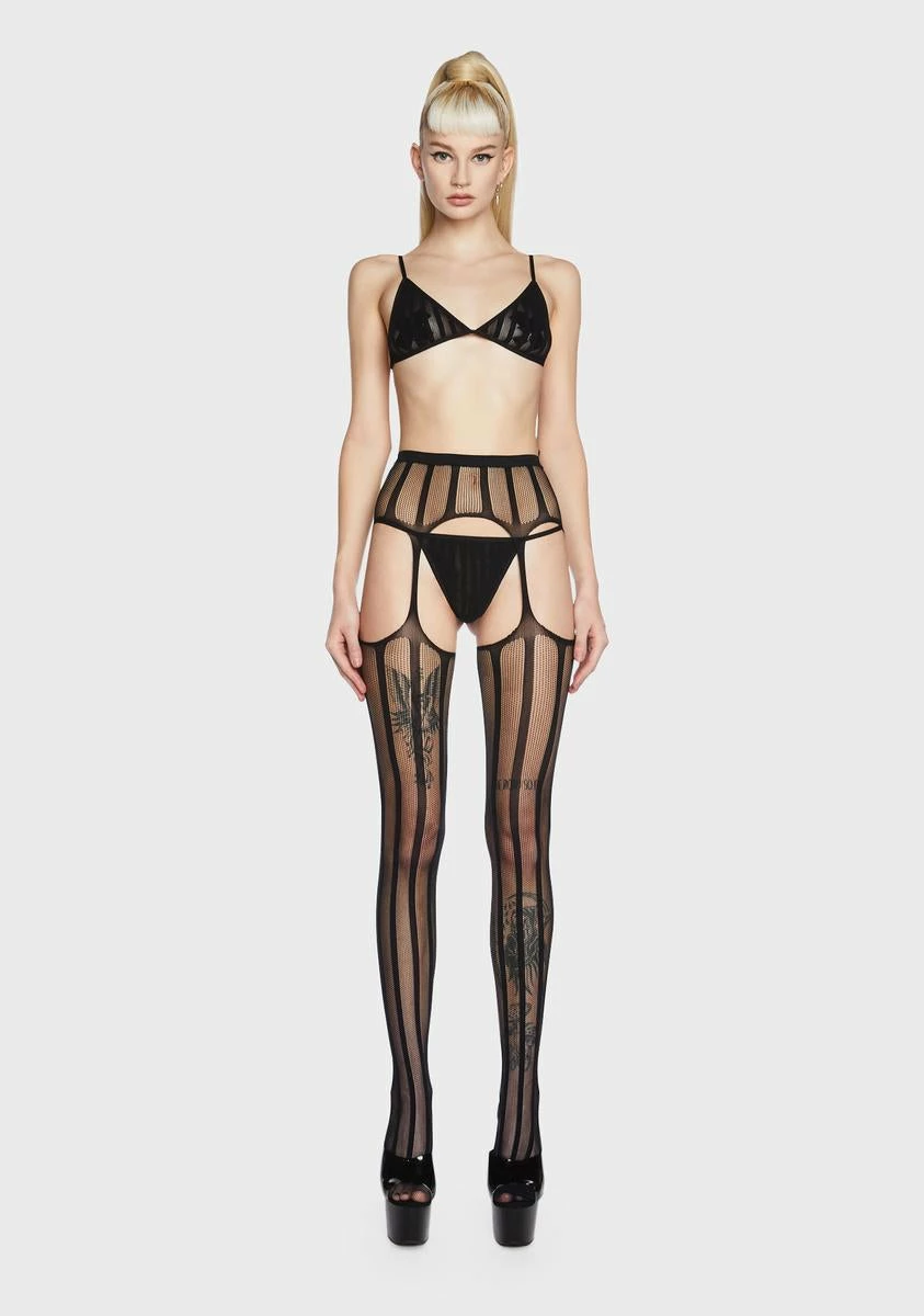 cuz make that move. This lingerie set includes a triangle bra top that has a sheer mesh construction, a striped design, adjustable shoulder straps, and a matching G-string thong panty and garter belt with attached stockings.