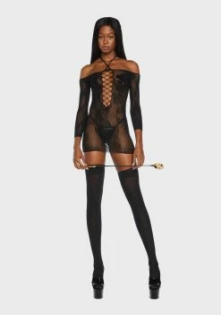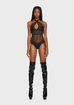 cuz we don’t have time to waste. This bodysuit comes in a lace and mesh construction, with a halter and back tie closure, a v-neck, open back, and crotchless fit.