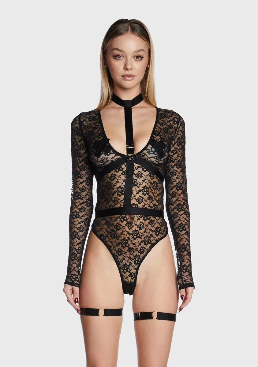 cuz have a fun night. This set includes a floral lace teddy that has long sleeves, a plunging neckline, a nylon harness and choker with O-ring hardware, and matching leg garters.