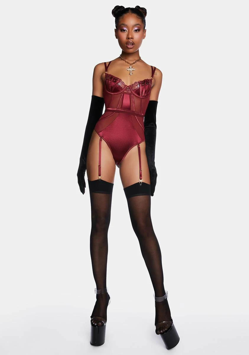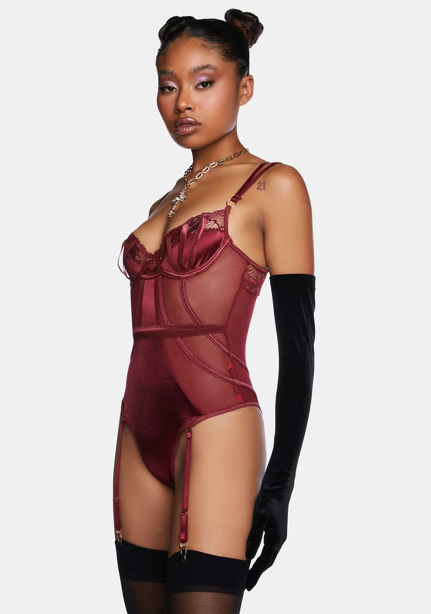 let’s make our escape. This bodysuit has a stretchy partially-sheer construction, metallic lace trim, adjustable shoulder straps, a back cutout, and adjustable garter straps.