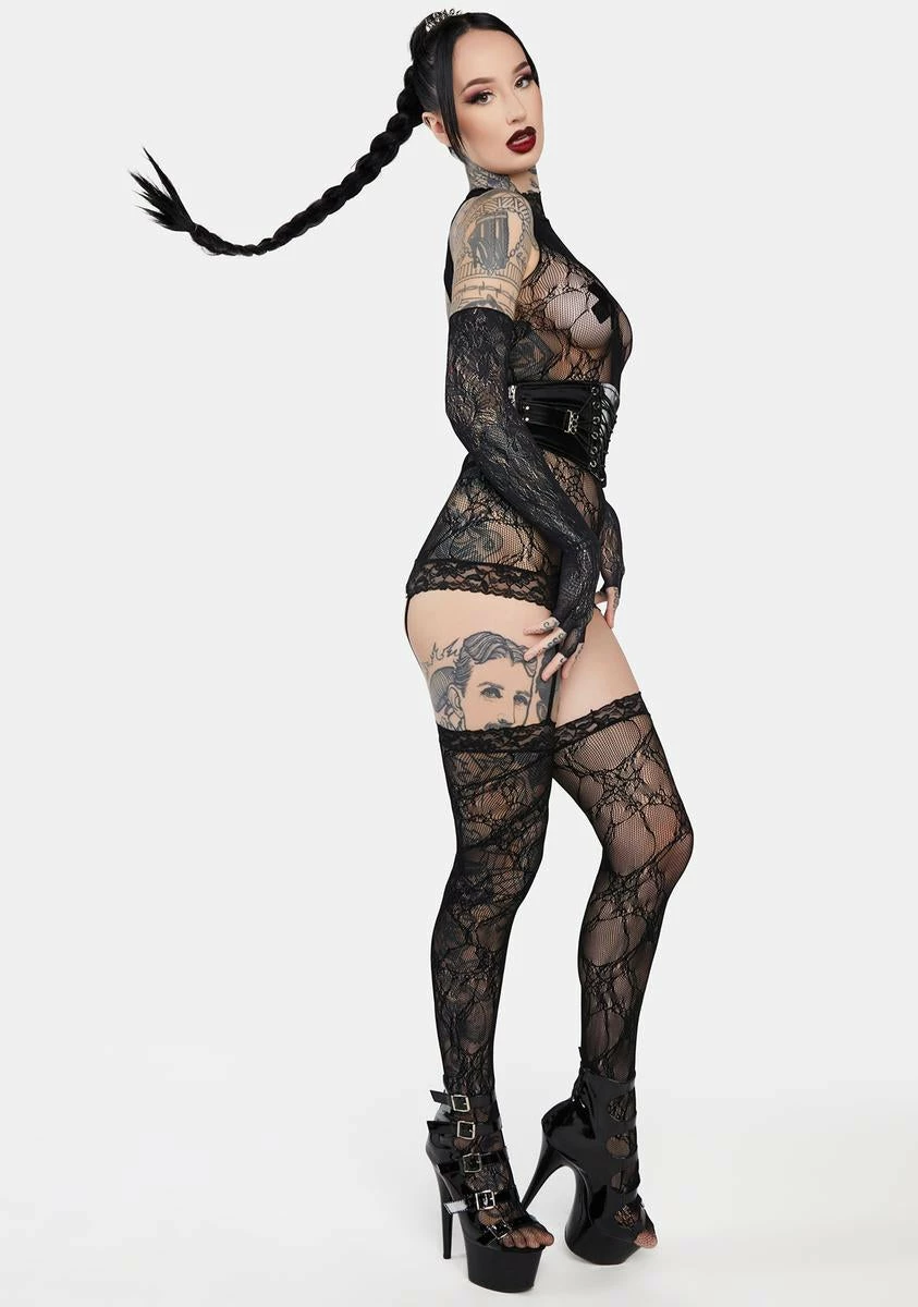 you come first. This mini bodystocking dress has a stretchy sheer lace construction, a mock neckline, attached garter straps and thigh-high stockings, and an open back.