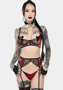 got you unleashed! This 3-piece lingerie set has a stretchy satin and sheer lace construction, underwire bust cups, adjustable shoulder straps, and back hook-and-eye closures. Includes a bra, a garter belt with adjustable straps, and a G-string thong.